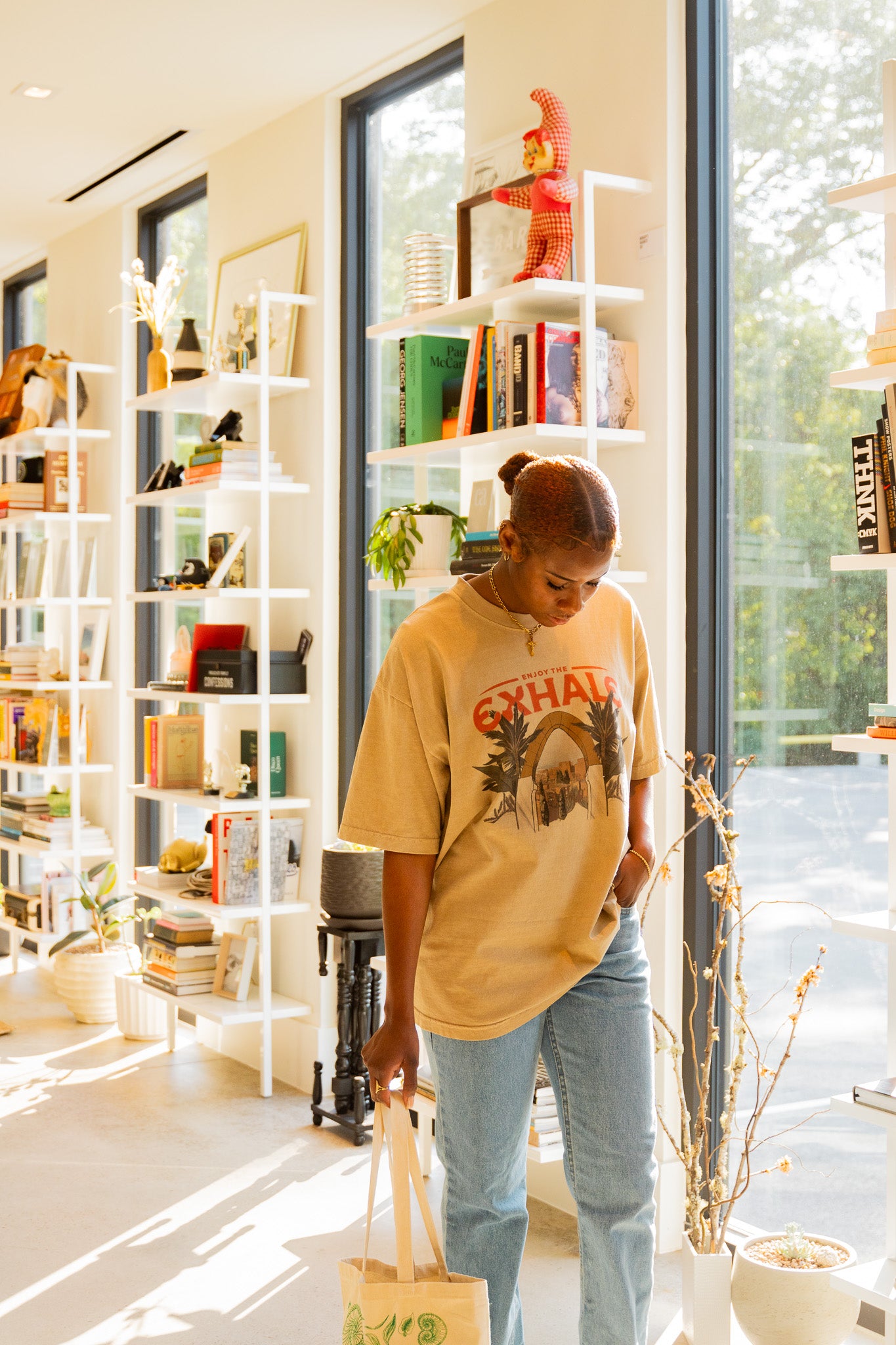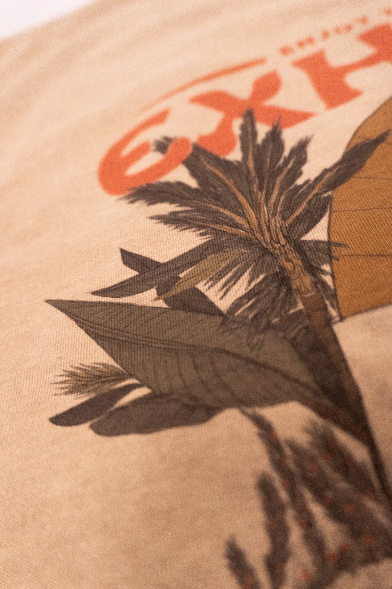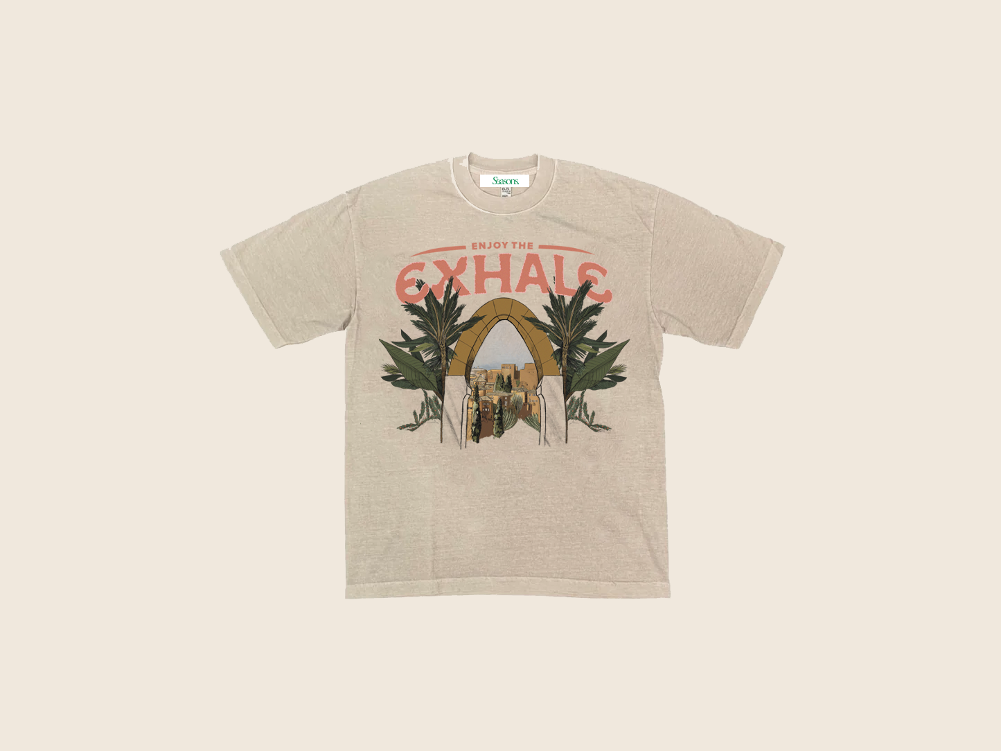 A 6.5oz/y2, shrink-free 100% cotton garment-dyed tee shirt. With a Ribbed collar made of heavy weighted material. It features a front graphic with the words "enjoy the exhale". This tee has been washed to give off a faded and warm tan look. We recommend going true to size. Sky, our model is 5’8 and is wearing a large.