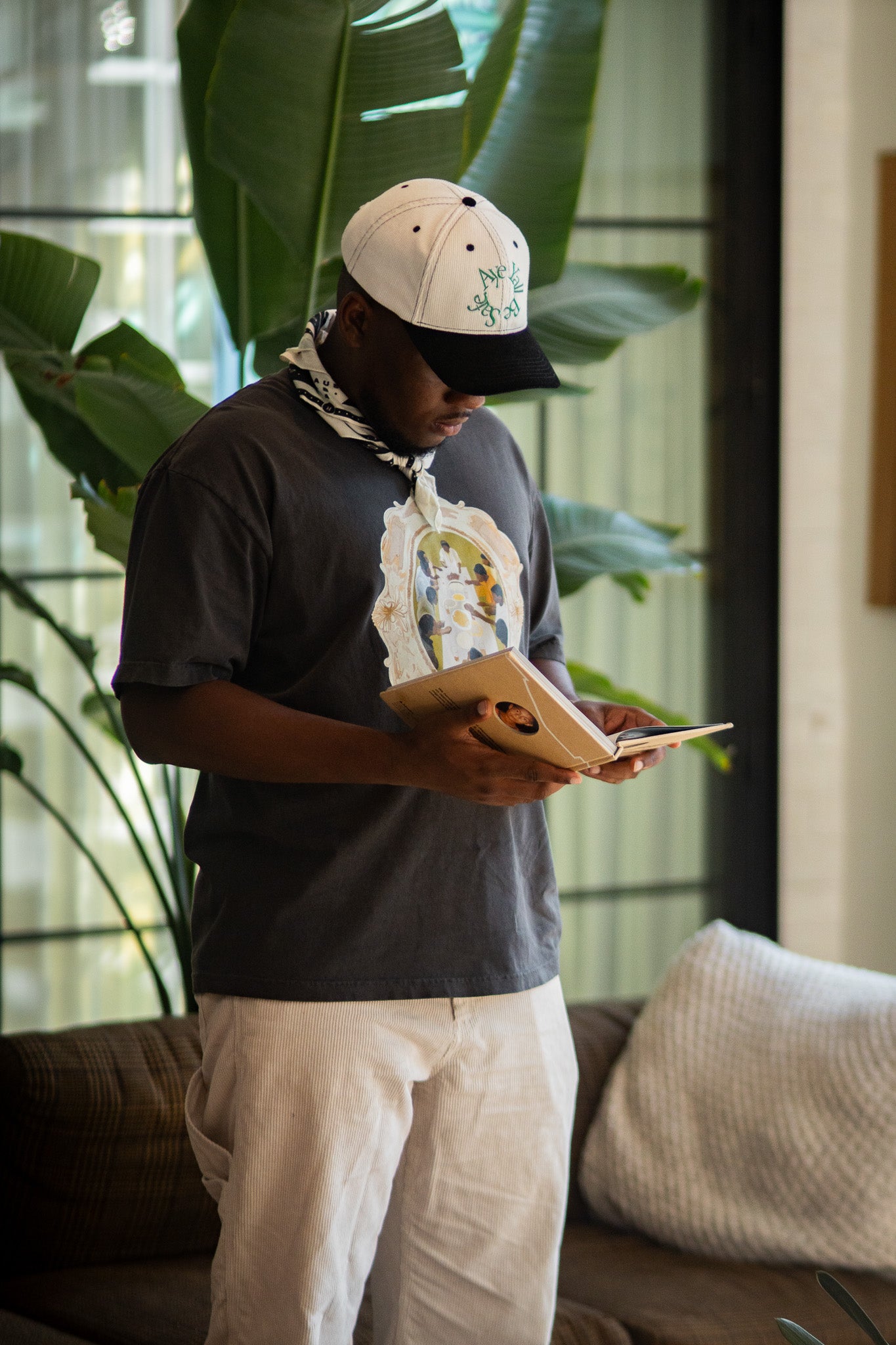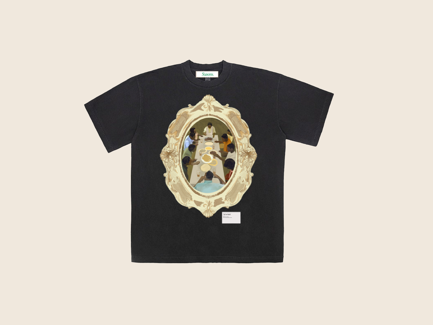 A 6.5oz/y2, shrink-free 100% cotton garment-dyed tee shirt. With a Ribbed collar made of heavy weighted material. It features a front graphic of a family sitting down to enjoy a meal. This tee has been washed to give off a faded black look. We recommend going true to size. Tyler, our model is 6’1 and is wearing a large.